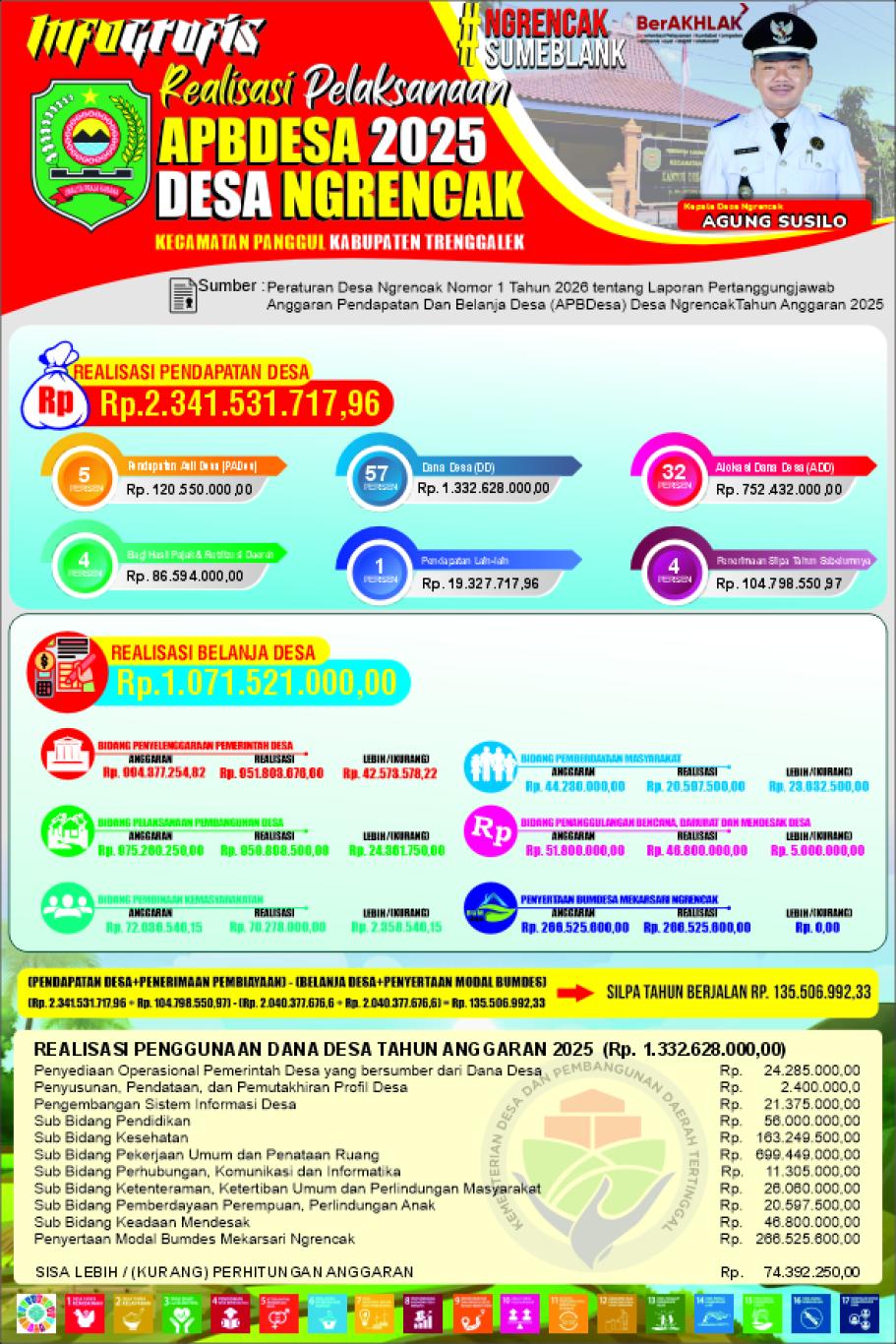 Laporan ini disusun untuk memberikan gambaran mengenai realisasi pelaksanaan Anggaran Pendapatan Dan Belanja Desa Tahun Anggaran 2025 Desa Ngrencak Kecamatan Panggul Kabupaten Trenggalek.