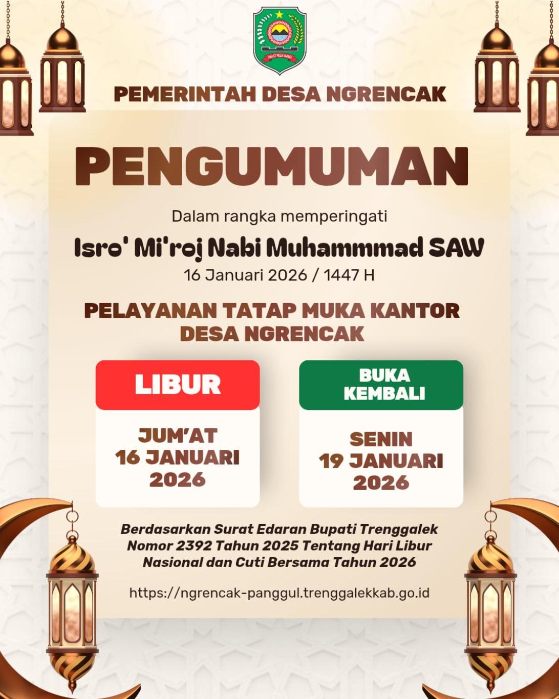 Pengumuman dalam rangka Peringatan Isro' Mi'roj Nabi Muhammad SAW 1446 H. Pelayanan tatap muka Pemerintah Desa Ngrencak libur pada hari Jum'at 16 Januari 2026, buka kembali pada hari Senin 19 Januari 2026. Berdasarkan Surat Edaran Bupati Trenggalek Nomor 2392 Tahun 2025 tentang Hari Libur Nasional Dan Cuti Bersama.